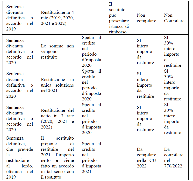 Tenuto conto che, potrebbero verificarsi casi in cui alla data del 31 dicembre 2019, a seguito di sentenza definitiva o accordo, la restituzione è stabilita al netto, si ritiene che il sostituto d’imposta possa fruire del credito d’imposta di cui al comma 2, in relazione alle restituzioni avvenute dal 1° gennaio 2020.