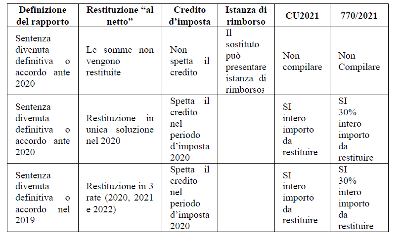 Tenuto conto che, potrebbero verificarsi casi in cui alla data del 31 dicembre 2019, a seguito di sentenza definitiva o accordo, la restituzione è stabilita al netto, si ritiene che il sostituto d’imposta possa fruire del credito d’imposta di cui al comma 2, in relazione alle restituzioni avvenute dal 1° gennaio 2020.