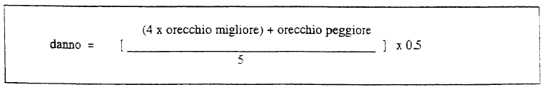 In tutti i casi di perdita uditiva bilaterale, la percentuale di danno biologico si ricava calcolando la perdita di funzionalità uditiva per ciascun orecchio ed applicando la seguente formula :